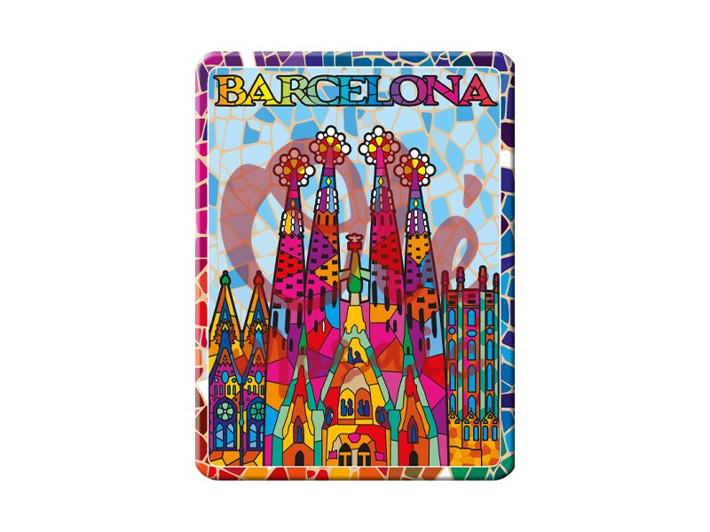 Aimant métallique de 8 cm avec une représentation vibrante de la Sagrada Familia, emblème architectural de Barcelone. Cet aimant coloré se distingue par son design de style mosaïque, qui capture l’essence unique de la célèbre basilique d’Antoni Gaudí. Les détails dans des tons vifs d’orange, de jaune et de bleu, ainsi que le texte «Barcelona» en haut, en font un souvenir attrayant qui célèbre la culture et l’histoire de la ville. Parfait pour décorer votre réfrigérateur ou comme cadeau.