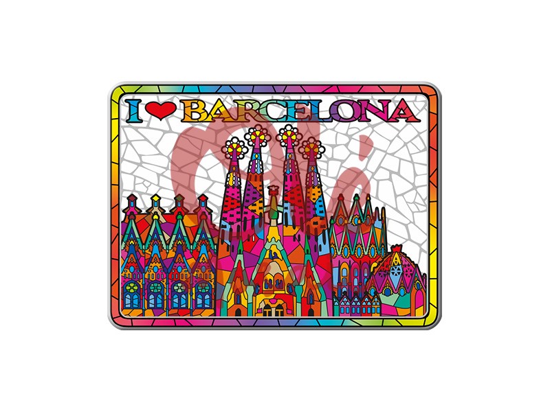 Aimant en métal de 8 cm avec une illustration vibrante de l’emblématique Sagrada Familia de Barcelone. Ce design attrayant utilise une palette de couleurs vives et un style de mosaïque, qui capture les détails architecturaux caractéristiques du monument. En haut, le texte « I ♥ Barcelona » ressort, ajoutant une touche personnelle qui évoque l’amour pour cette ville. Un souvenir parfait pour se souvenir de la beauté de Barcelone.