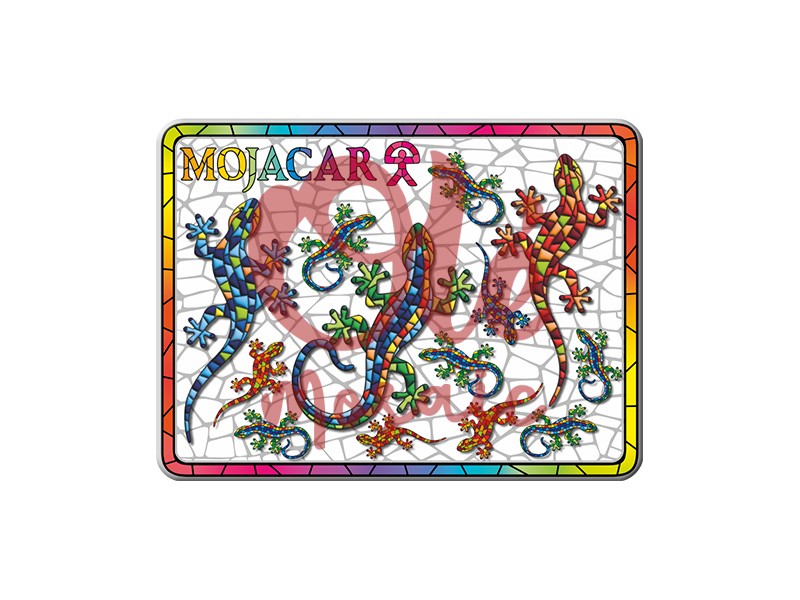 Aimant métallique de 8 cm, décoré de salamandres frappantes dans un design vibrant inspiré du style mosaïque typique de Mojácar. Cet aimant présente une série de lézards colorés dans des tons bleus, verts, rouges et jaunes, sur un fond blanc qui simule la céramique. Avec l’inscription « MOJÁCAR » en haut, ce souvenir capture l’essence du folklore local et est idéal pour emporter un souvenir visuel de cette charmante localité andalouse.