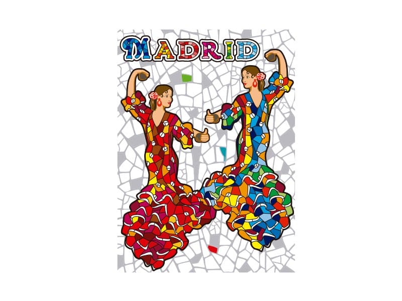 Aimant de 7,5 cm inspiré du flamenco madrilène, représentant deux « bailaoras » avec leurs costumes à volants vibrants. Le design, qui utilise des couleurs vives comme le rouge, le bleu et le jaune, met en valeur la joie et la passion de cette danse. Les figures, sur un fond de mosaïque, capturent le mouvement et la grâce du flamenco, avec une touche artistique qui célèbre la culture espagnole. Parfait pour se souvenir de l’essence de Madrid.