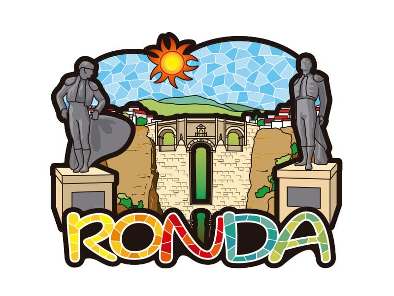 Aimant qui capture l’éemblématique vue panoramique de Ronda, avec le célèbre pont sur le Tajo comme élément central. Ce souvenir attrayant inclut des figures représentant la culture taurine, encadrées par un paysage montagneux et un soleil radieux en arrière-plan. Avec un design coloré présentant le nom « Ronda » dans des tons vibrants, cet aimant est un souvenir parfait de la beauté et du folklore de cette ville andalouse historique.