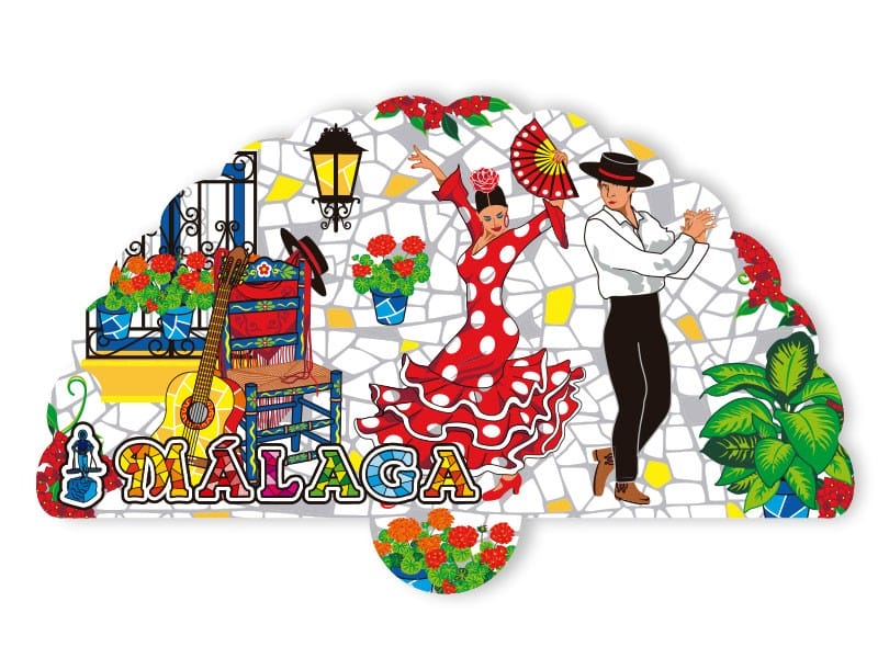 Aimant représentant un patio andalou vibrant de Malaga. Cet aimant coloré représente une bailaora et un bailaor de flamenco en plein mouvement, entourés de pots de fleurs et d’ornements typiques. Le fond présente une mosaïque qui évoque les azulejos de la région, tandis que le mot « MÁLAGA » ressort avec un design joyeux. Idéal pour se souvenir de la chaleur et de l’esprit festif de l’Andalousie sur toute surface métallique.