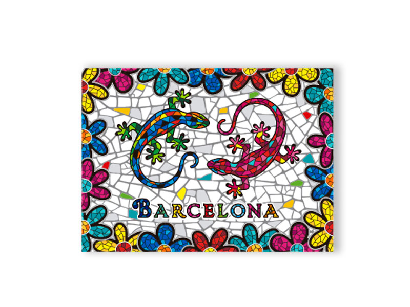 Aimant de 7,5 cm, décoré d’une illustration colorée de deux salamandres sur un fond de mosaïque florale, qui représente l’essence vibrante de Barcelone. Cet aimant attrayant se distingue par ses motifs aux tons vifs, comme le rouge, le bleu et le vert, ainsi que des fleurs en jaune et fuchsia, évoquant le célèbre style trencadís. Avec le texte « Barcelona » en lettres proéminentes, c’est un charmant souvenir qui capture la créativité et l’art de la ville.