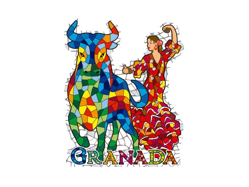 Aimant avec un design vibrant représentant un taureau et une danseuse de flamenco, symboles emblématiques de la culture espagnole, spécifiquement de Grenade. Décoré d’une mosaïque colorée qui fait ressortir les tons bleus, rouges et jaunes, cet aimant capture l’essence du folklore andalou. La danseuse de flamenco, vêtue d’une robe rouge ornée, affiche un geste joyeux, tandis que le taureau, avec un air majestueux, complète cette représentation culturelle. Le mot « GRANADA » se distingue en bas, ajoutant une touche distinctive.