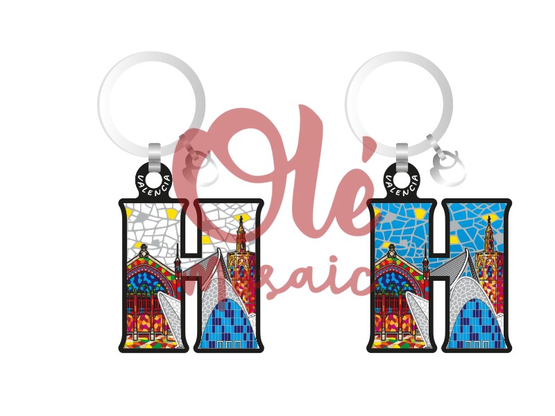 Porte-clés en bois en forme de lettre « H », inspiré de Valence. Cet accessoire attrayant présente des éléments emblématiques de la ville, tels que les façades détaillées de la Cité des Arts et des Sciences, représentées dans des couleurs vibrantes bleu, rouge et jaune. Avec une surface conçue avec des techniques de mosaïque qui évoquent le célèbre style valencien, c’est un souvenir idéal qui combine fonctionnalité et art en un seul produit.