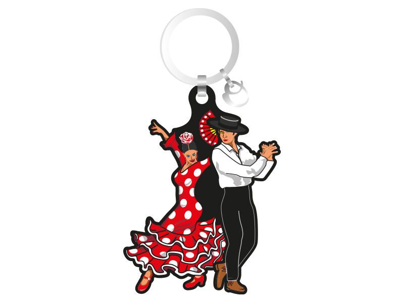 Porte-clés en bois représentant un couple de danseurs de flamenco. Ce porte-clés coloré se distingue par son design vibrant : la danseuse porte une robe rouge à pois blancs et les cheveux ornés d’une fleur rouge, tandis que le danseur est vêtu d’une chemise blanche et d’un pantalon foncé. Parfait pour emporter un morceau de la culture andalouse partout, sa technique de découpe du bois lui confère une touche artisanale et originale.