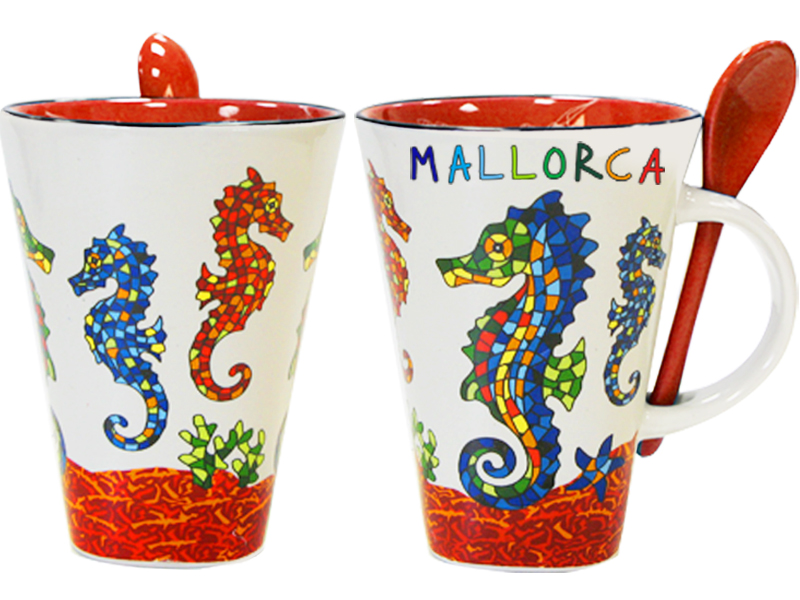 Tasse en céramique ornée d’hippocampes colorés, inspirée par la beauté marine de Majorque. Ce verre élégant présente un design artisanal, peint à la main, avec des détails aux tons vibrants et un fond beige qui met en valeur les motifs marins. Sur la partie supérieure, le mot « MALLORCA » est inscrit en lettres frappantes, tandis que les hippocampes et la végétation aquatique ajoutent une touche artistique et méditerranéenne. Il est complété par une cuillère assortie, idéale pour déguster vos boissons préférées.