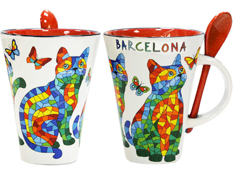 Mug en céramique au design coloré, inspiré par la vie vibrante de Barcelone. Ce récipient original présente un charmant chat construit avec des mosaïques colorées, avec des papillons voletant autour. Avec une finition beige et des détails rouges, la tasse comprend également une cuillère assortie, parfaite pour savourer vos boissons préférées. Un souvenir original qui capture l’essence artistique de la ville comtale.