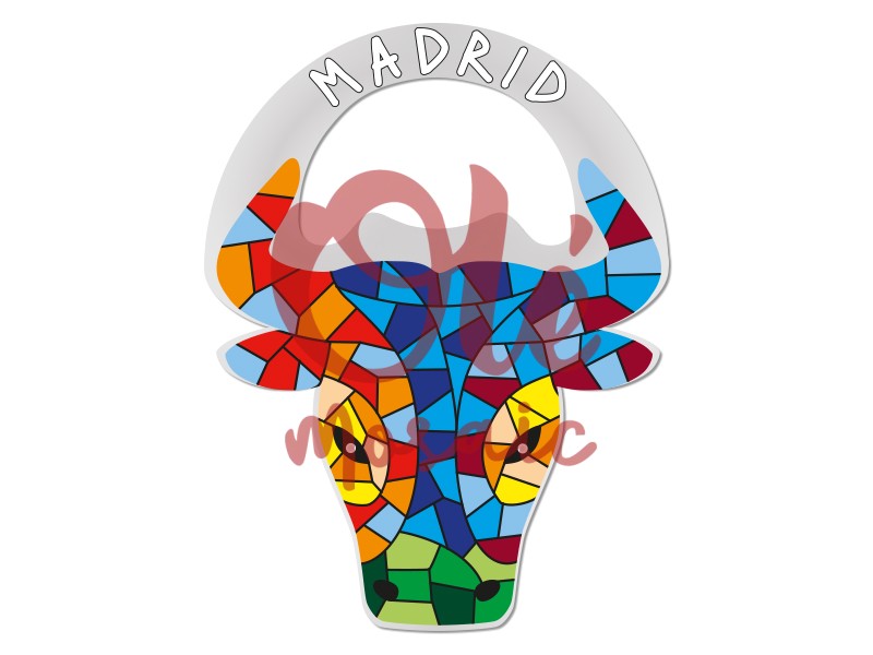 Abridor de metal con forma de toro, que representa un diseño vibrante y colorido característico de Madrid. Este artículo decorativo cuenta con un acabado de epoxy que resalta su llamativa paleta de colores, con tonos azules, rojos, amarillos y verdes que evocan el folclore español. La cabeza del toro, símbolo icónico de la cultura española, se integra con el texto «MADRID» en la parte superior, lo que lo convierte en el souvenir o regalo perfecto.