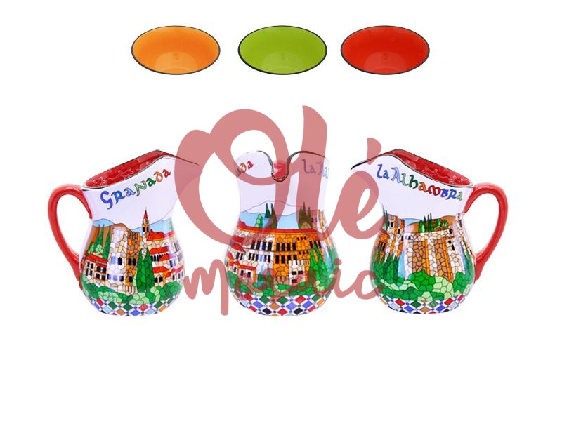 Jarra de cerámica decorada con una colorida representación de la Alhambra y el paisaje granadino, ideal para servir bebidas. Esta pieza, diseño artesanal, pintado a mano, destaca por su diseño en tonos beige, rojo y verde, con detalles de mosaico que evocan la rica herencia cultural de la región. El contorno asimétrico de la jarra y las inscripciones « Granada » y « la Alhambra » le añaden un toque distintivo y atractivo, convirtiéndola en el souvenir perfecto de esta emblemática ciudad andaluza.