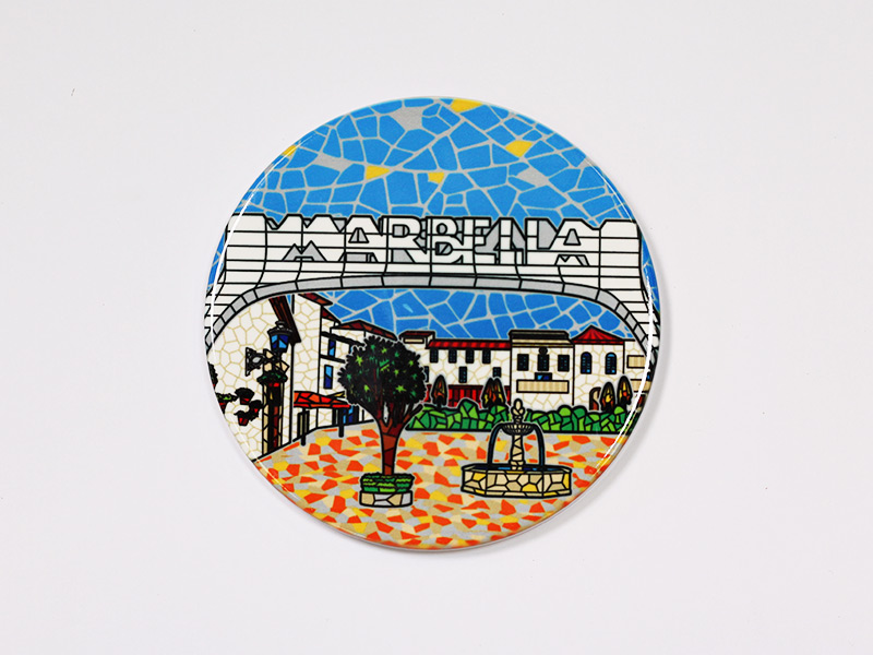 Sous-verre en céramique décoré d’une représentation vibrante de Marbella. Ce sous-verre attrayant présente un design en mosaïque qui illustre la célèbre entrée de la ville, encadrée par un ciel bleu éclatant. Les couleurs vives, comme le jaune et le vert, rehaussent les éléments architecturaux et la végétation, tandis que le texte « MARBELLA » ressort en blanc. Idéal pour ajouter une touche de style Andalou à n’importe quelle table, combinant fonctionnalité et art.