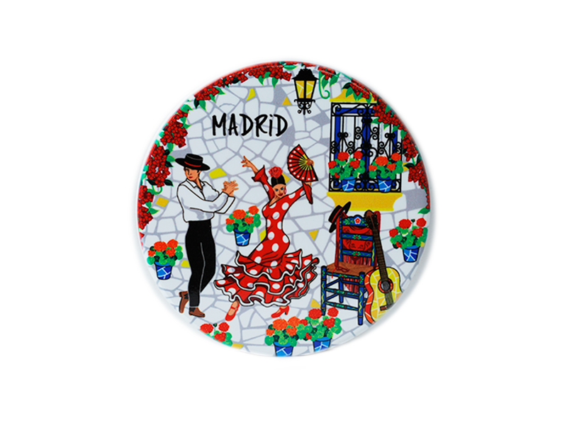 Sous-verre en céramique au design vibrant qui capture l’essence d’un patio madrilène. Ce sous-verre attrayant représente un couple dansant le flamenco, entouré de pots de fleurs colorés et de détails d’un balcon charmant. Avec le mot « MADRID » mis en évidence, cet article combine des techniques de conception artisanale, peintes à la main, avec une palette de couleurs vives, idéal pour tout amateur de culture espagnole. Sa forme ronde et décorative en fait un excellent souvenir ou un complément pour la maison.
