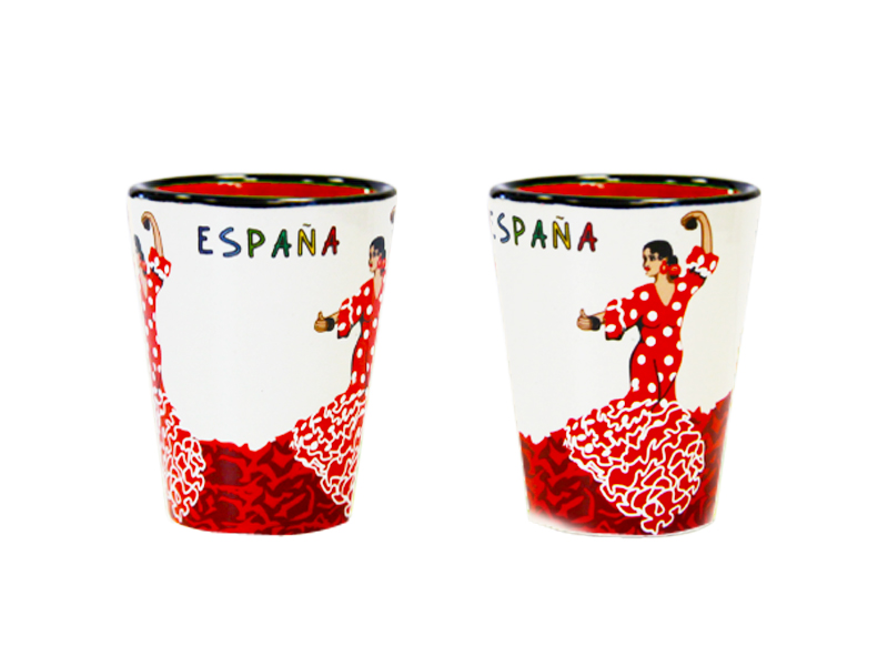 Verre à shot en céramique décoré d’une bailaora vêtue d’un vibrant costume rouge et blanc, représentant l’esprit du flamenco. Avec un fond beige et des détails rouges, ce verre affiche le mot « ESPAGNE » en couleurs, ajoutant une touche culturelle et festive. Idéal pour savourer vos boissons, c’est une pièce authentique qui capture l’essence du folklore espagnol à chaque gorgée.
