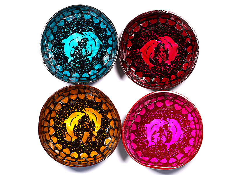 Olé Mosaic » Bols » 4 Bols en noix de coco de 13 x 6 cm. Dauphin. Motif cœurs.