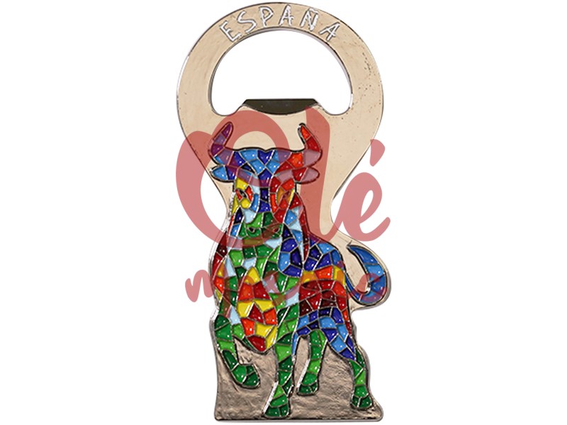 Abridor de metal decorado con un vibrante toro español, diseño artesanal, pintado a mano, con una rica variedad de colores. Este diseño colorido presenta un mosaico de azules, verdes, rojos y amarillos, que representa la icónica figura del toro, símbolo del folclore y la cultura españolas. Con la palabra « ESPAÑA » grabada en la parte superior, este abridor no solo es funcional, sino también una pieza artística que celebra la esencia de España. Ideal para coleccionistas y amantes de la cultura española.