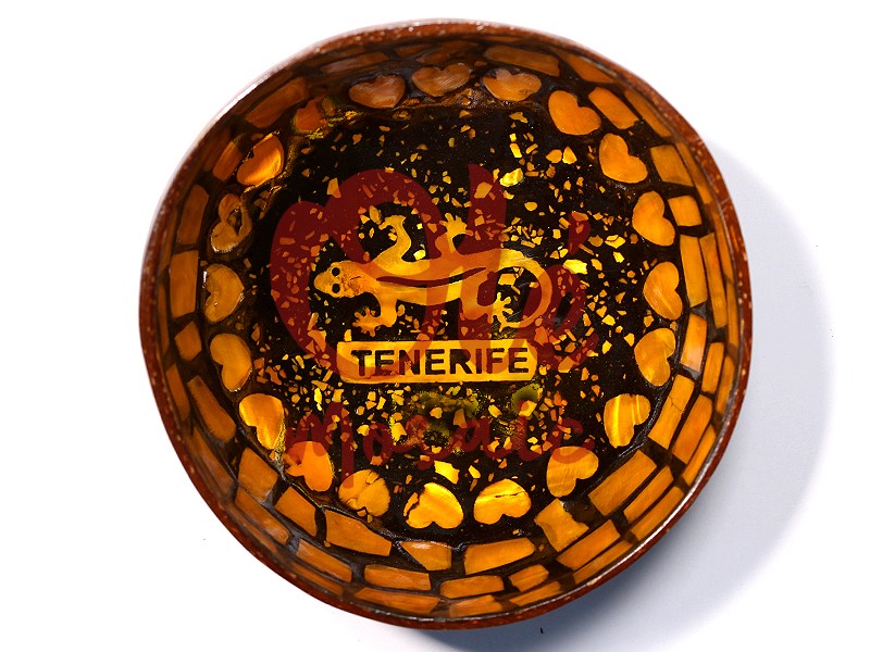 Bol de coco amarillo decorado con una salamandra, que representa la esencia de Tenerife. Este atractivo bol, elaborado con cáscara de coco, presenta un diseño artesanal, pintado a mano, con una salamandra amarilla como motivo central sobre un fondo oscuro, rodeada de corazones dorados. La inscripción « TENERIFE » le da un toque distintivo, convirtiéndolo en un souvenir perfecto y funcional para recordar la belleza de las Islas Canarias.