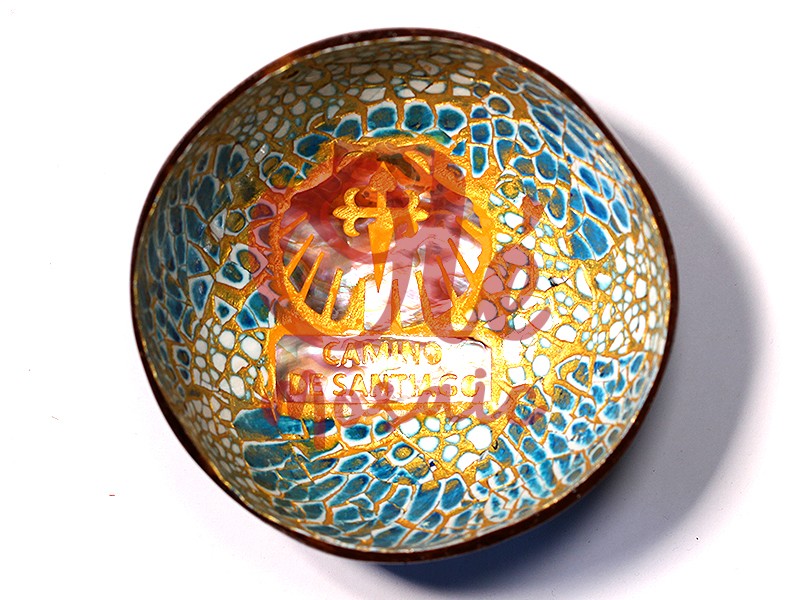 Bol de coco de un vibrante azul, adornado con un intrincado diseño que evoca el Camino de Santiago. Este elegante bol presenta una concha de Santiago dorada como motivo central, rodeada de un entramado de pequeños mosaicos en tonos azul celeste y detalles en blanco, creando un efecto visual cautivador. Con un acabado brillante y texturizado, es una pieza decorativa ideal para recordar la experiencia de esta famosa ruta espiritual.