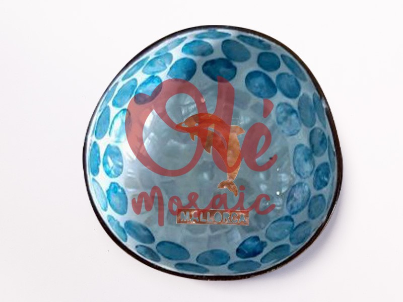 Bol de coco decorado en un vibrante azul, inspirado en el encanto marítimo de Mallorca. Este atractivo bol presenta un diseño artesanal, pintado a mano, con motivos de delfines en el centro, rodeado de un acabado de efecto mosaico en diferentes tonos de azul y detalles en bronce. Ideal para servir aperitivos o como pieza decorativa, refleja la belleza del mar Mediterráneo y la esencia de la isla.