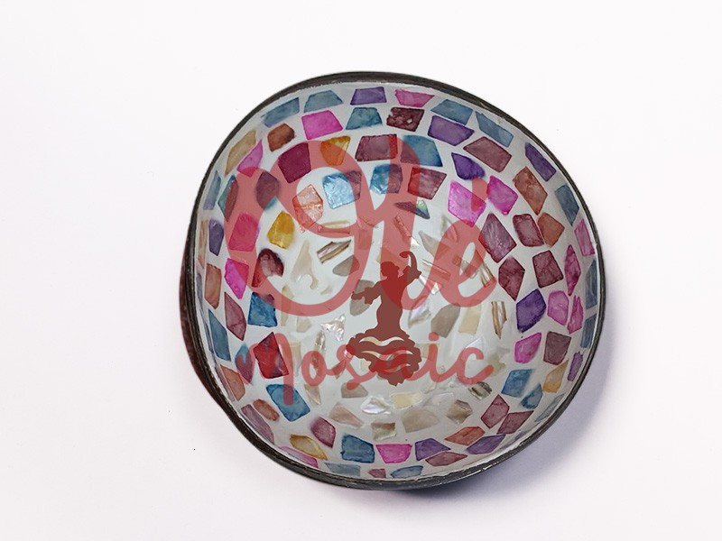 Bol de coco decorado con coloridos mosaicos en tonos azul, rosa y morado, inspirado en la danza flamenca. Este atractivo cuenco presenta un diseño artesanal, pintado a mano, que representa a una bailaora en una pose dinámica, evocando el espíritu del folclore español. Su elaborada técnica artesanal y la vibrante combinación de colores lo convierten en una pieza ideal para cualquier hogar, aportando un toque de cultura y tradición andaluza.