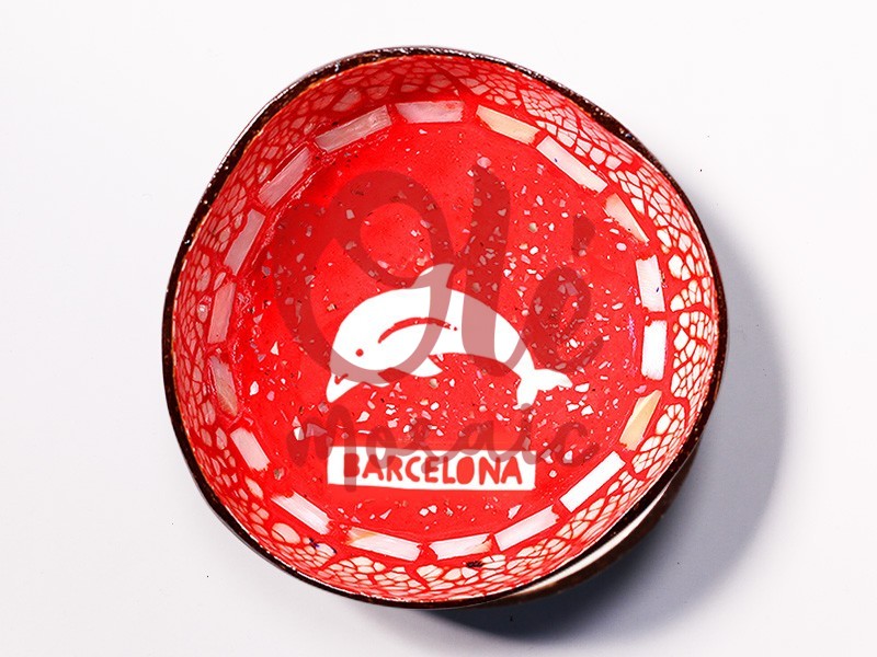 Bol de coco rojo con una ilustración de un delfín, inspirado en la vibrante cultura de Barcelona. Este original bol combina un diseño muy especial con un acabado brillante en un atractivo color rojo, decorado con detalles que evocan las olas del mar. En el centro, se encuentra la imagen de un delfín, acompañado del nombre « Barcelona » en un estilo moderno, capturando la esencia del Mediterráneo y su fauna marina. Ideal como recuerdo o para darle un toque especial a cualquier mesa.