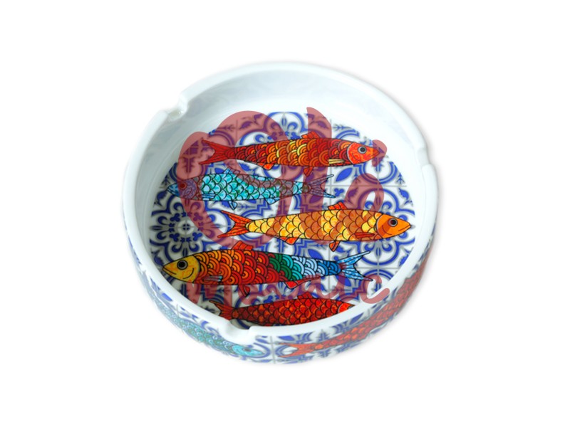 Cendrier en céramique de 8 cm décoré de sardines colorées, idéal pour les collectionneurs et les amateurs de céramique artisanale. Ce design vibrant présente des sardines dans des tons rouge, bleu et jaune sur un fond blanc orné de motifs décoratifs bleus. La technique de conception artisanale, peinte à la main, souligne sa singularité et son savoir-faire, en faisant un élément décoratif attrayant et fonctionnel qui évoque le charme de la Méditerranée.