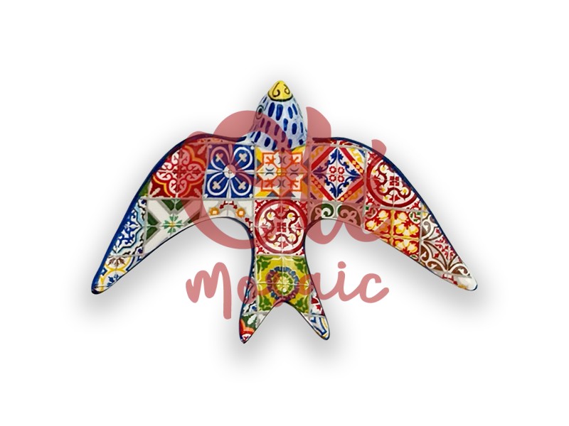 Colgador de cerámica con forma de golondrina, inspirado en los vibrantes mosaicos de Lisboa. Este producto, de diseño único y diseño artesanal, pintado a mano, combina una variedad de colores brillantes y patrones geométricos tradicionales, típicos de la cerámica portuguesa. Con su forma estilizada que evoca el vuelo de la golondrina, es un elemento decorativo perfecto para añadir un toque auténtico y cultural a cualquier espacio.
