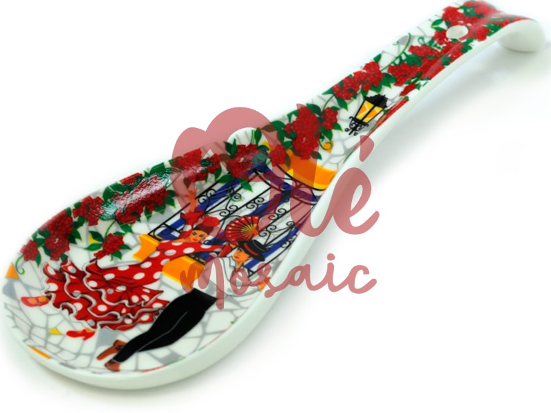 Louche en céramique avec un design coloré qui évoque l’essence d’un patio andalou. Cet ustensile, sur une base blanche adornée de fleurs rouges, montre une scène vibrante d’un couple en costumes traditionnels, parmi lesquels se distingue une bailaora avec une robe à pois rouges. La technique de peinture à la main lui confère un caractère unique, transformant cette louche en une pièce fonctionnelle et ornementale, parfaite pour ajouter une touche de culture espagnole à votre cuisine.