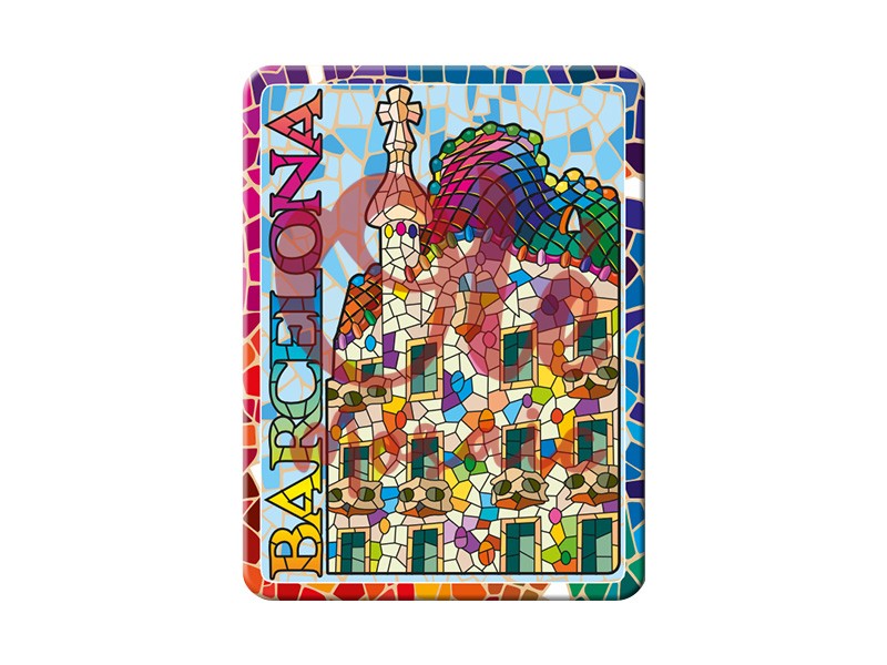 Aimant métallique reproduisant l’emblématique Casa Batlló de Barcelone, avec un design qui évoque son célèbre trencadís. Mesurant 8 cm, cet aimant se distingue par ses couleurs vives et les détails de mosaïque qui caractérisent le bâtiment, y compris son toit ondulé et ses fenêtres ornées. Le mot « Barcelona » est imprimé en rouge éclatant, ce qui en fait un souvenir parfait de l’architecture moderniste de Gaudí.