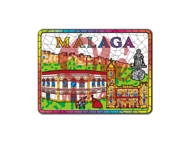 Aimant métallique avec un panorama coloré de Malaga, de 8 cm. Cet aimant attrayant présente des illustrations emblématiques de la ville, telles que la célèbre Plaza de Toros et la cathédrale, le tout encadré dans un design vibrant qui évoque le style des mosaïques andalouses. Les détails argentés et les couleurs vives qui capturent l’essence et le folklore de Malaga se distinguent, parfait pour se souvenir de cette belle ville.