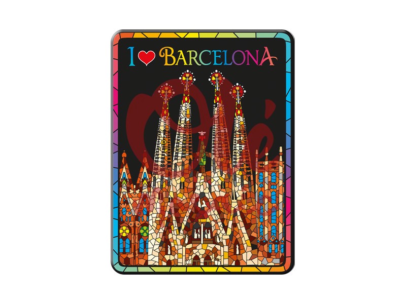 Aimant métallique représentant l’emblématique Sagrada Familia de Barcelone, de 8 cm. Cet aimant se distingue par son design vibrant avec des couleurs chaudes et des détails de mosaïque, qui capturent la majesté de la célèbre basilique. Le fond noir contraste parfaitement avec les tonalités lumineuses du monument et inclut le texte « J’aime Barcelone » dans une typographie joyeuse, ce qui en fait un souvenir idéal pour se souvenir de la beauté de cette ville catalane.