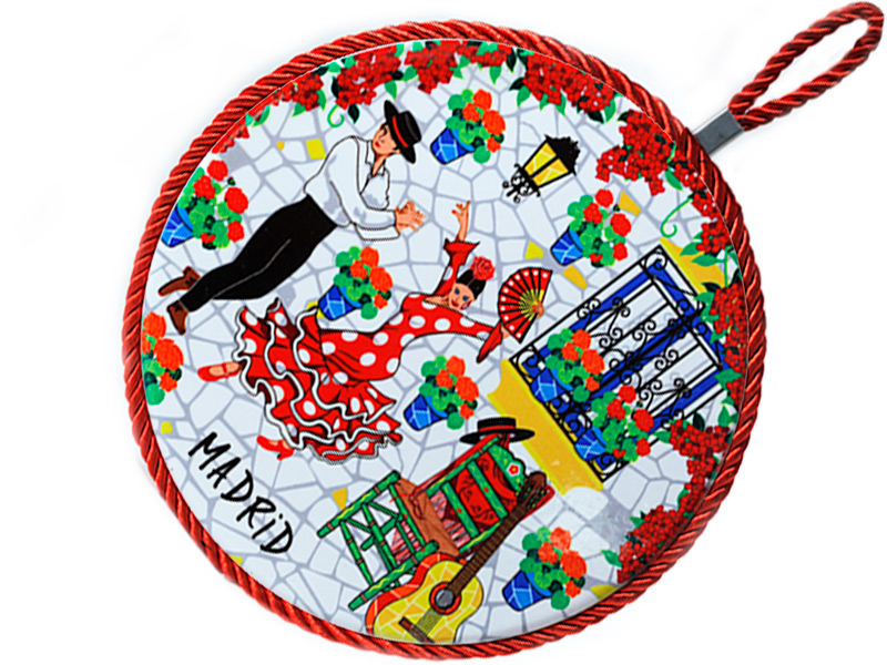 Dessous de plat en céramique décoré d’une scène vibrante d’un patio madrilène. Ce produit, idéal pour ajouter une touche espagnole à votre table, présente un design artisanal, peint à la main, qui inclut une danseuse de flamenco en robe rouge et un homme en costume de charro, entourés de fleurs et d’éléments typiques. Le fond avec mosaïque classique rehausse les couleurs vives et l’essence festive de Madrid. Avec un délicat bord en corde, il est à la fois pratique et décoratif.