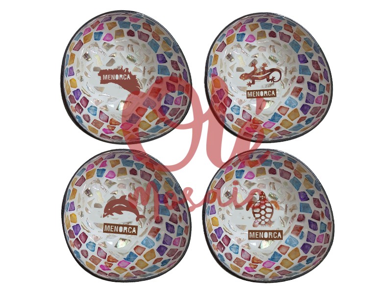 Boles de coco de 13 x 6 cm, decorados con motivos marinos que evocan la esencia de Menorca. Cada bol, elaborado con coco, presenta un colorido mosaico que combina vibrantes tonos naranja, rosa y azul. En el centro, se aprecian ilustraciones de un delfín, una tortuga y una lagartija, acompañadas de la palabra «Menorca». Son perfectos para añadir un toque distintivo y cultural a cualquier espacio, o como regalo.
