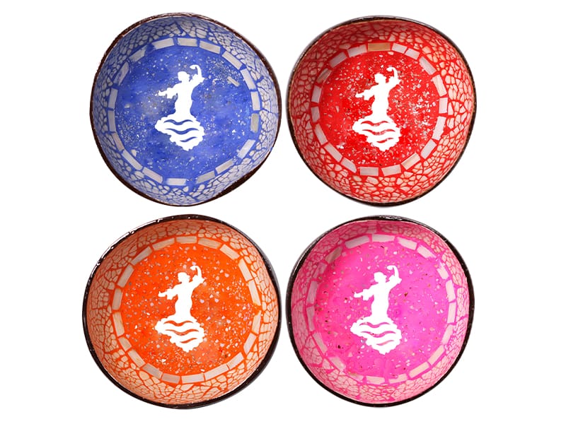Boles de coco de 13 x 6 cm, diseñados con la elegante figura de una bailaora flamenca. Cada bol presenta un color vibrante, con un acabado diseño artesanal, pintado a mano, que resalta motivos artísticos en tonos azul, rojo, naranja y rosa. La decoración incluye un intrincado diseño de mosaico que enmarca a la bailaora en movimiento, capturando la esencia del flamenco. Perfectos como elemento decorativo o funcional, estos boles fusionan tradición y modernidad con estilo.