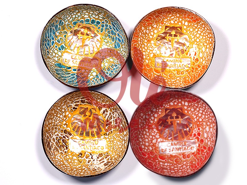 Set de cuatro boles de coco decorados con el símbolo del Camino de Santiago. Este atractivo conjunto de boles, de 13 x 6 cm, presenta colores vibrantes que evocan la alegría y la espiritualidad asociadas a esta famosa peregrinación, con tonalidades azules, naranjas, doradas y rojas. Cada bol resalta la textura natural del coco, lo que no solo le da un aspecto artesanal, sino que también asegura durabilidad y resistencia.