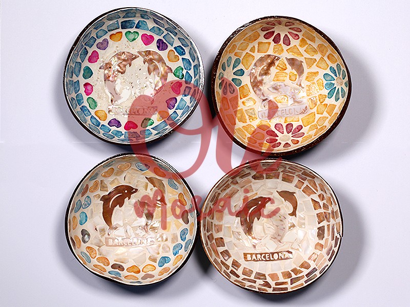 Olé Mosaic » Bols » 4 Bols de coco de 13 x 6 cm. Delfín. Corazones y flores. Barcelona.