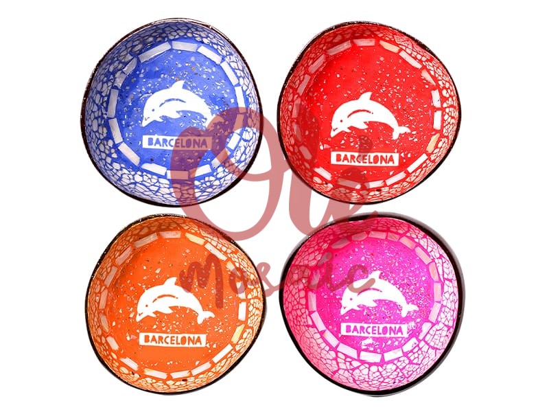 Olé Mosaic » Bols » 4 Bols de coco de 13 x 6 cm. Delfín. Azul, rojo, naranja y fucsia. Barcelona.
