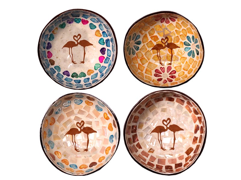 Boles de coco de 13 x 6 cm decorados con mosaicos de colores inspirados en el paisaje andaluz. Cada bol presenta un diseño único que resalta la figura de dos flamencos en un corazón, rodeados de delicadas flores y corazones en tonalidades vibrantes como azules, rosas y naranjas. Fabricados con coco, estos boles son ideales como decoración o para servir aperitivos, añadiendo un toque de arte y cultura española a cualquier mesa.