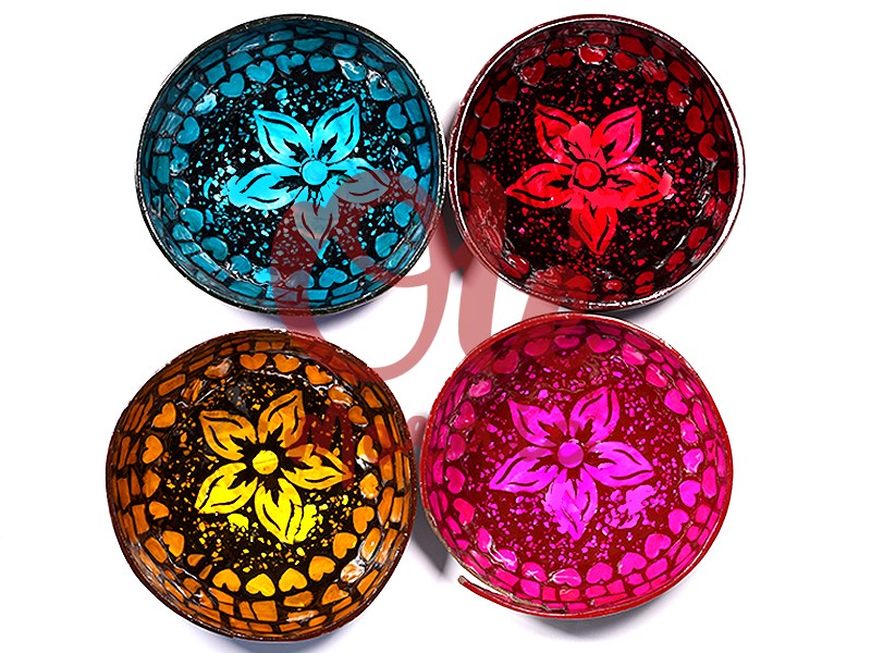 Boles de coco de 13 x 6 cm decorados con motivos florales. Este juego de cuatro boles coloridos presenta diseños pintados a mano en tonos vibrantes como azul, rojo, naranja y fucsia, sobre un fondo negro que realza su atractivo visual. Cada bol muestra una flor central rodeada de pequeños corazones, lo que los convierte en piezas perfectas para darle un toque alegre y exótico a tu hogar o como regalo original. Ideales para servir aperitivos o como elementos decorativos.