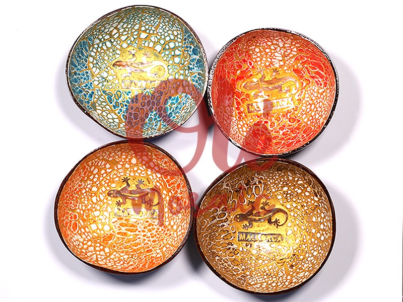Set de cuatro boles de coco inspirados en la fauna de Mallorca. Este conjunto único de boles, cada uno con un diámetro de 13 cm y una altura de 6 cm, es una fusión perfecta de arte y funcionalidad. Cada pieza presenta un vibrante juego de colores: azul, rojo, naranja y dorado, que evocan la luminosidad y el encanto del paisaje mallorquín. La superficie de los boles tiene un recubrimiento que simula una textura de malla, añadiendo un elemento visual y táctil fascinante. En el centro de cada bol, un distintivo estampado de una salamandra, símbolo de la biodiversidad local, se acompaña de la palabra «MALLORCA» en dorado, resaltando la autenticidad y el arraigo cultural del producto.