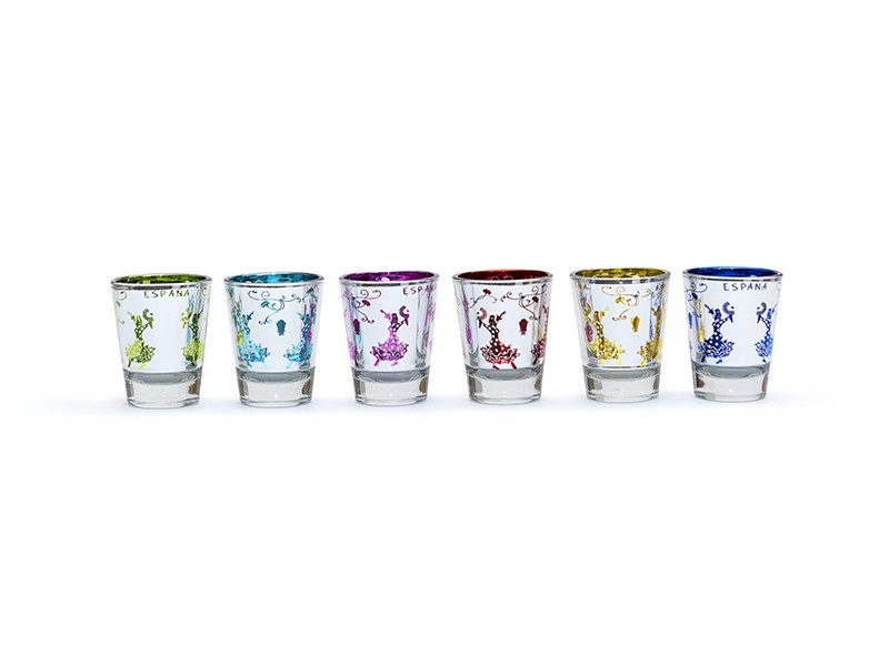 Set de seis chupitos de vidrio metalizado, perfectos para compartir con amigos y recordar la esencia de España. Cada vaso presenta diseños coloridos y metalizados, con ilustraciones que evocan el folclore español, como bailaoras en plena fiesta. Los colores vibrantes de cada vaso, que incluyen verdes, azules, rojos y amarillos, contrastan con la transparencia del vidrio, aportando un toque alegre y contemporáneo a cualquier celebración. Ideales como recuerdo o para uso diario, estos vasos son una pieza distintiva para quienes aprecian la cultura española.