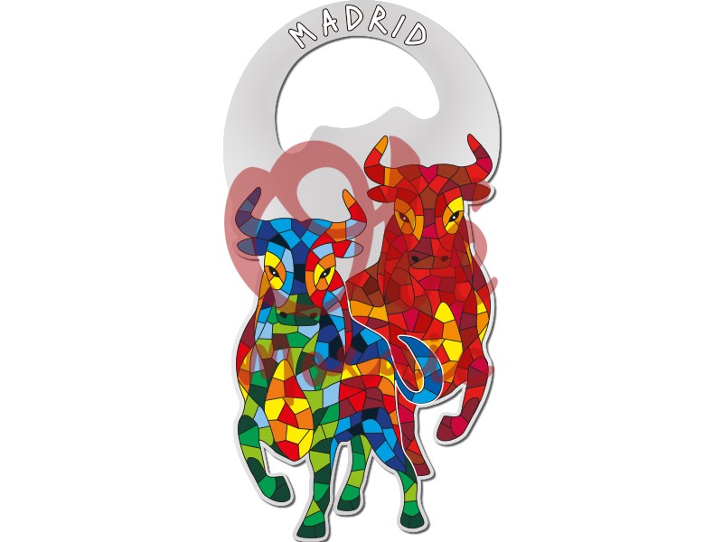 Abridor metálico con diseño de dos toros de colores vibrantes, inspirado en la cultura madrileña. Este abridor, decorado con epoxy, presenta un estilo artístico que recuerda a un mosaico, con tonos rojos, azules, verdes y amarillos. En la parte superior destaca la palabra «MADRID», en referencia a la emblemática ciudad. Un souvenir funcional y atractivo que representa la tradición taurina española.