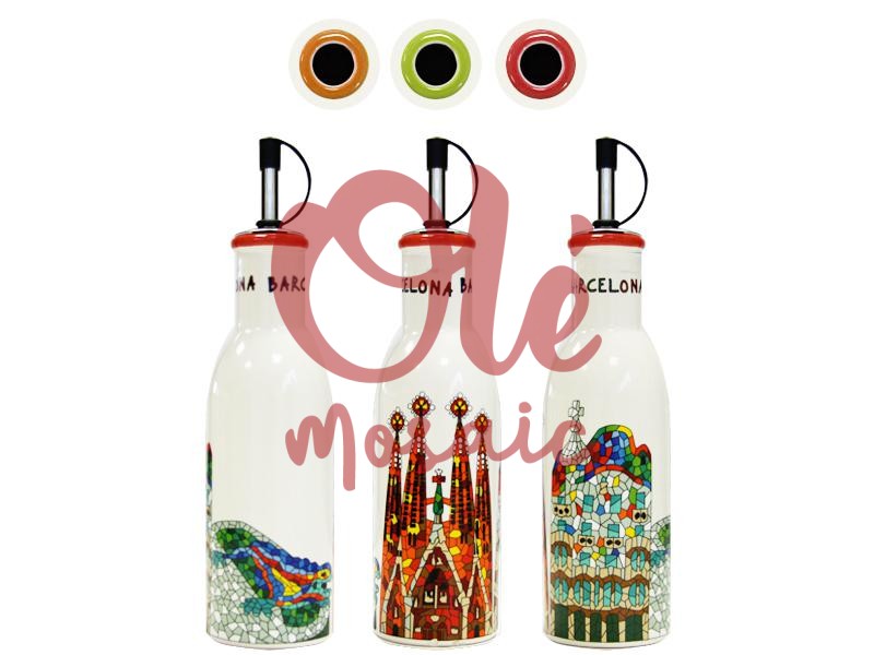 Esta aceitera de cerámica de Barcelona es una exquisita pieza que fusiona funcionalidad y arte, ideal para quienes aprecian la cultura mediterránea. Con su acabado en beige, la botella exhibe una encantadora panorámica de Barcelona, donde destacan emblemáticos monumentos como la Sagrada Familia y el Parque Güell, cuidadosamente ilustrados mediante la técnica de calca en colores vibrantes. Cada detalle visual captura la esencia de la arquitectura modernista de Gaudí, convirtiendo este artículo en un verdadero homenaje a la herencia cultural de la ciudad. La tapa, en tonos naranja, verde y negro, no solo aporta un toque distintivo, sino que también es un elemento práctico que facilita su uso diario en la cocina. Perfecta para embellecer cualquier mesa, esta aceitera no solo sirve para almacenar aceite, sino que se convierte en un bonito recuerdo que evoca los momentos vividos en esta emblemática ciudad. En Olé Mosaic, nos especializamos en la distribución de souvenirs de cerámica al por mayor, y esta aceitera es una excelente opción para tiendas de regalos turísticos que buscan productos auténticos, decorativos y representativos de Barcelona. Con este recuerdo, los turistas pueden llevarse a casa un pedazo de la vibrante cultura catalana.