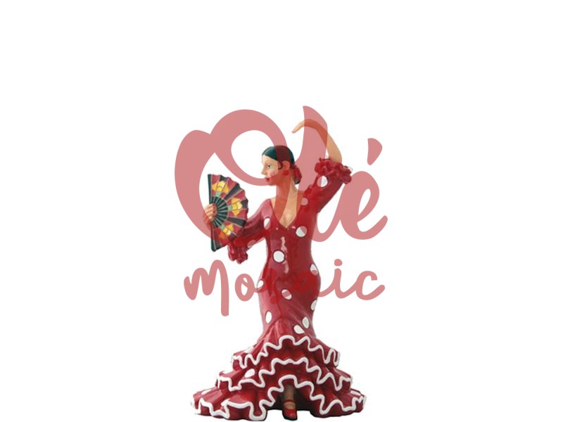 Figura de una bailaora de flamenco de 10 cm de altura, diseño artesanal, pintado a mano, en vibrantes colores rojo y blanco. Esta encantadora representación captura la esencia del flamenco español, con un vestido de volantes y grandes lunares blancos, y un abanico que complementa su elegante pose. Con un diseño detallado y una expresión llena de energía, es un souvenir perfecto que refleja la cultura andaluza y su tradición folclórica.