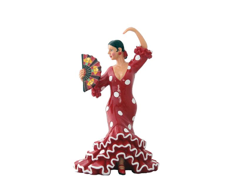 Figura de 12 cm que representa a una bailaora de flamenco. Esta encantadora figura, diseño artesanal, pintado a mano, en rojo y blanco, captura la esencia del baile español con su vestido de volantes y lunares. Sostiene un abanico colorido, reflejo de la cultura andaluza. Con sus finos detalles y pose dinámica, es un excelente souvenir que evoca el arte del flamenco y el espíritu de Andalucía.
