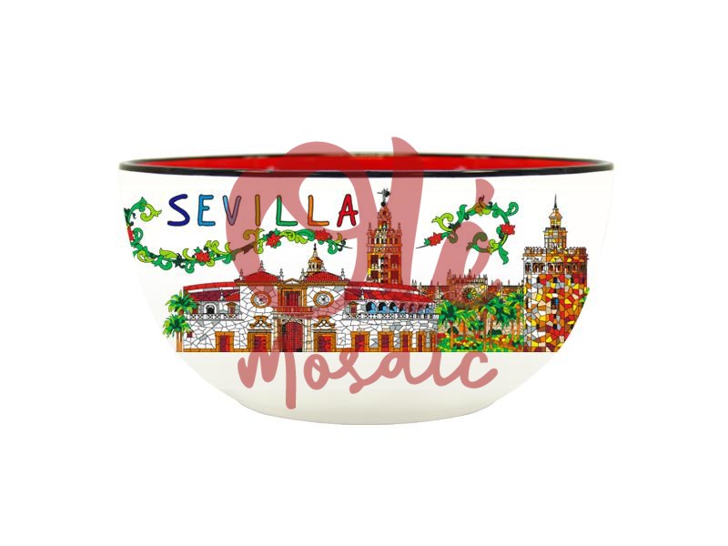 Bol de cerámica de 11 cm, decorado con una vibrante panorámica de Sevilla. Este atractivo bol presenta una colorida representación de la ciudad, destacando sus emblemáticos monumentos, como la Giralda y la Plaza de España, acompañados de motivos florales verdes. Su elegante borde rojo contrasta con el fondo beige, creando un diseño llamativo y adecuado tanto para decorar como para el uso diario. Ideal como recuerdo que evoca el encanto andaluz.