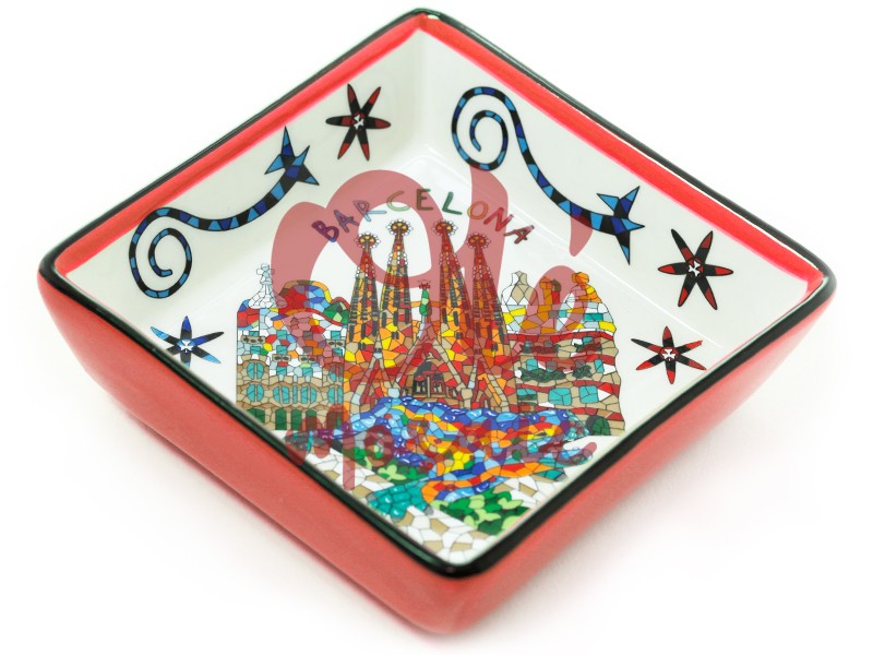 Bol de cerámica de 11,5 cm con una preciosa panorámica de Barcelona. Presenta un diseño cuadrado con bordes rojos y fondo blanco, donde destacan coloridas ilustraciones de la Sagrada Familia y otros monumentos emblemáticos de la ciudad. Este bol, decorado con estilo artesanal, incluye vibrantes detalles en mosaico y la palabra «Barcelona» escrita con un estilo desenfadado, capturando la esencia artística y cultural de la ciudad condal. Ideal como recuerdo o para añadir un toque decorativo a tu hogar.