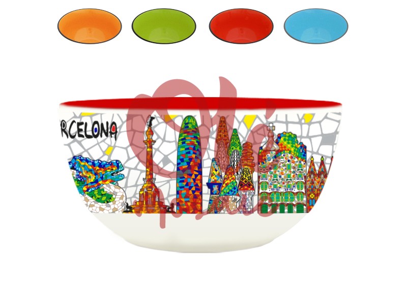 Bol de cerámica de 14 cm, inspirado en la emblemática ciudad de Barcelona. Este bol presenta un diseño vibrante que incluye elementos arquitectónicos destacados, como la Sagrada Familia y el Parque Güell. Decorado con colores vivos y un fondo blanco, su borde superior es de un rojo intenso que le da un toque moderno. Los motivos de mosaico, tan característicos de Gaudí, evocan la rica cultura y el arte barcelonés, convirtiéndolo en un souvenir perfecto para los amantes de la ciudad.