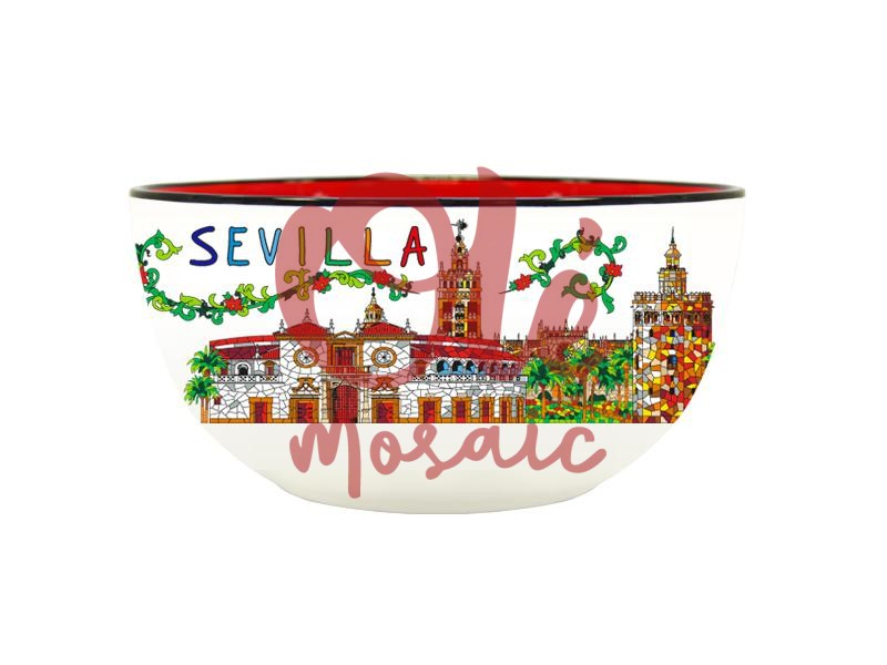 La inscripción «Sevilla» se muestra en un estilo tipográfico dinámico que resalta sobre el fondo y se complementa con un borde rojo que aporta un toque de calidez y color a la pieza. Este bol no solo es funcional, sino que también sirve como un atractivo elemento decorativo ideal para cualquier hogar, brindando un pedazo de la cultura sevillana en cada uso. Los turistas encontrarán en este bol de cerámica un recuerdo perfecto que representa la riqueza del patrimonio local y, al ser un producto de Olé Mosaic, garantiza autenticidad y calidad. Como mayoristas de souvenirs de cerámica, ofrecemos artículos ideales para tiendas de regalos turísticos que buscan representar lo mejor de la tradición andaluza.