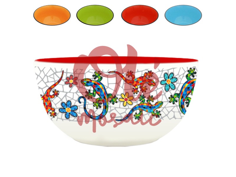 Bol de cerámica de 14 cm decorado con una vibrante ilustración de salamandras y flores, inspirada en el arte tradicional español. Su diseño incluye un fondo blanco con un exclusivo patrón de mosaico que realza los vivos colores de las salamandras, en tonos rojos, azules y verdes, junto a flores de diversas tonalidades. El interior del bol, de color rojo, aporta calidez y es ideal para darle un toque distintivo a cualquier mesa.