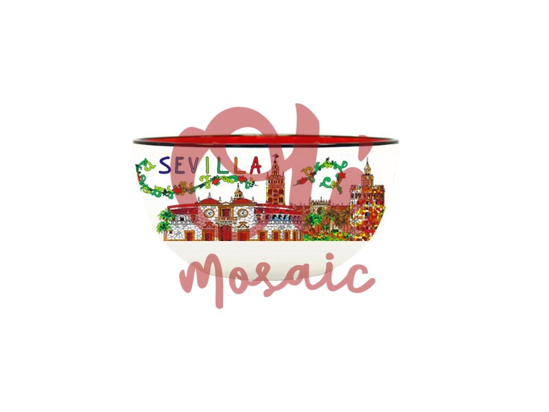 Bol de cerámica de 9 cm con una encantadora panorámica de Sevilla. Este producto destaca por su diseño en tonos beige y rojo, decorado con ilustraciones de monumentos emblemáticos de la ciudad, como la Giralda. Los detalles coloridos y la palabra «SEVILLA» añaden un toque vibrante y cultural. Ideal para servir aperitivos o como objeto decorativo, este bol es una representación artística de la rica herencia sevillana.
